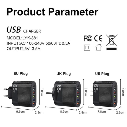 65W 6-in-1 Fast Charger – 4 USB & 2 Type-C Quick Charge Adapter for iPhone Samsung Xiaomi