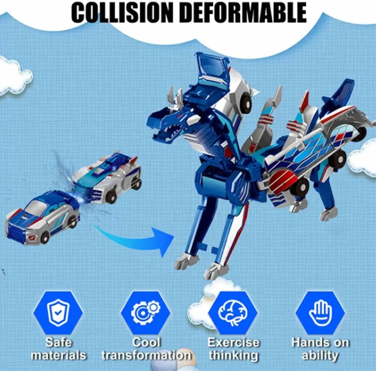 The dinosaur Transformation car toy, two car Transformation dinosaur, toy that combines dinosaurs and cars into one experiences a captivating and enchanting collision and transformation. Â It presents an amazing scene where the cars that turn into dinosaur show their unique charm.